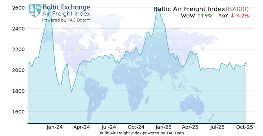 Global air cargo rates have returned to an upward trend. According to the TAC Index, in the week ending October 6th, the global Baltic Air Cargo Index (BAI00) rose by 1.9% week-on-week (WoW).