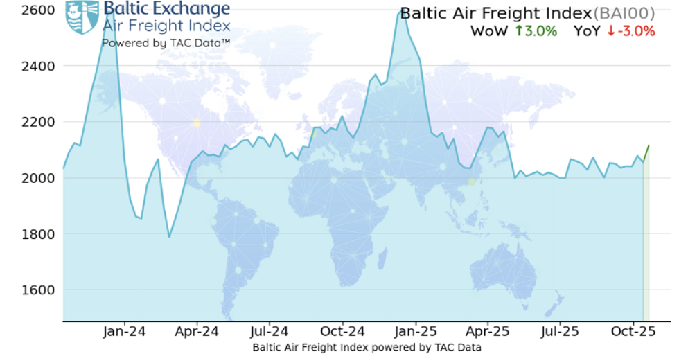 As of October 20th, the Baltic Air Cargo Index (BAI00), which tracks global air cargo rates, rose 3.0% week-on-week (WoW). Although this remains 3.0% lower than the same period last year, the moderate upward momentum of recent weeks has become more pronounced.