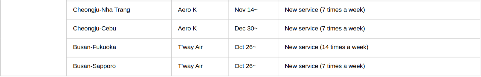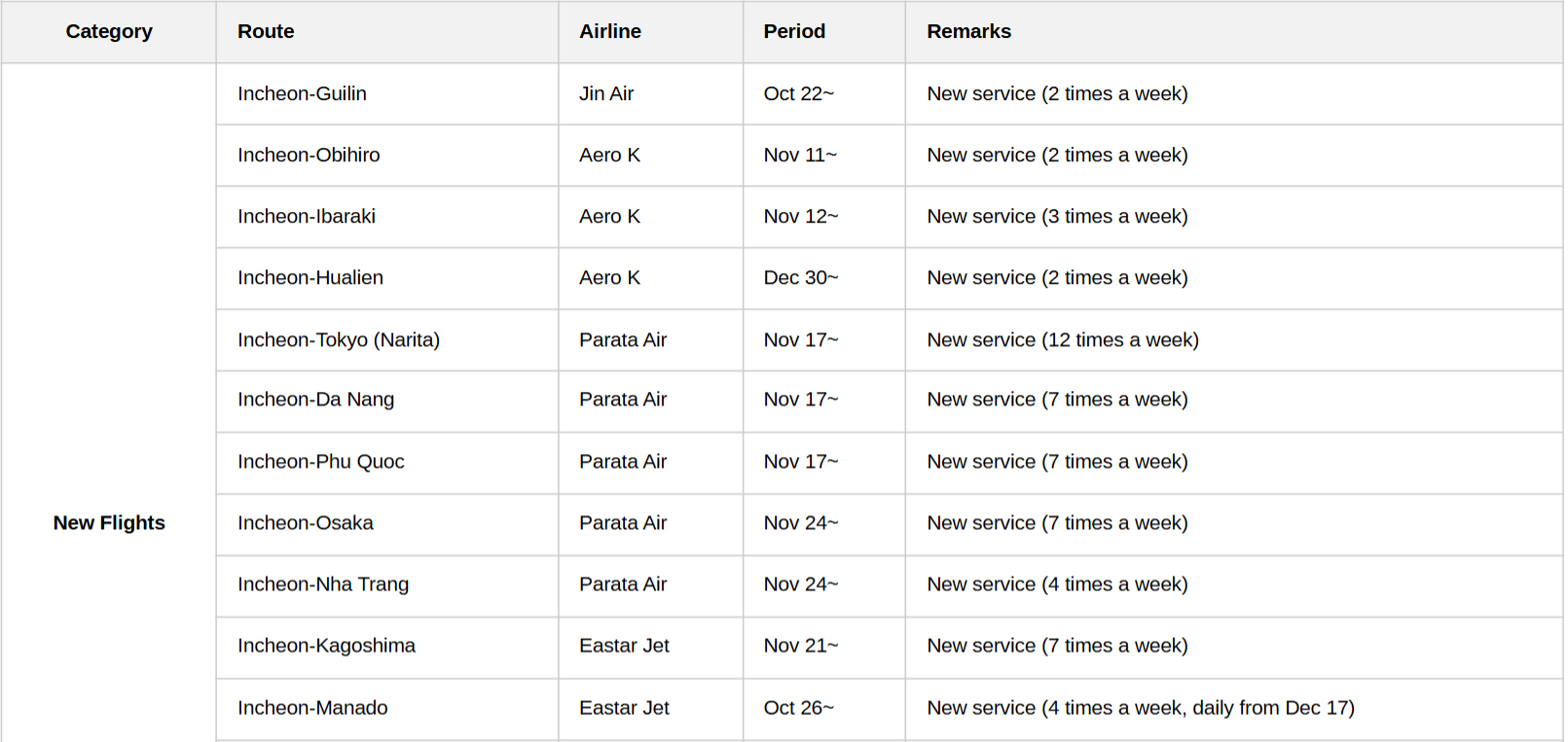 China Southern Airlines (CZ): Deployed B787 aircraft on the ICN-CAN route (3 weekly flights) from October 26 to November 14.