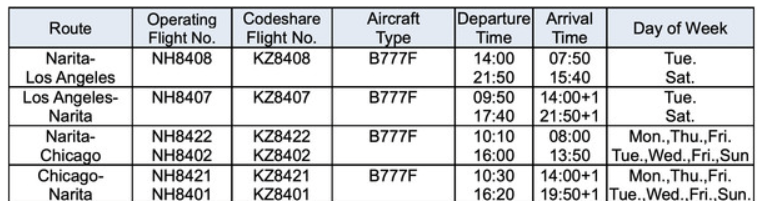 대상은 ANA가 777F 기재로 운항하는 나리타(NRT)에서 시카고(ORD), 로스앤젤레스(LAX) 노선에 대해 NCA가 편명을 공유.